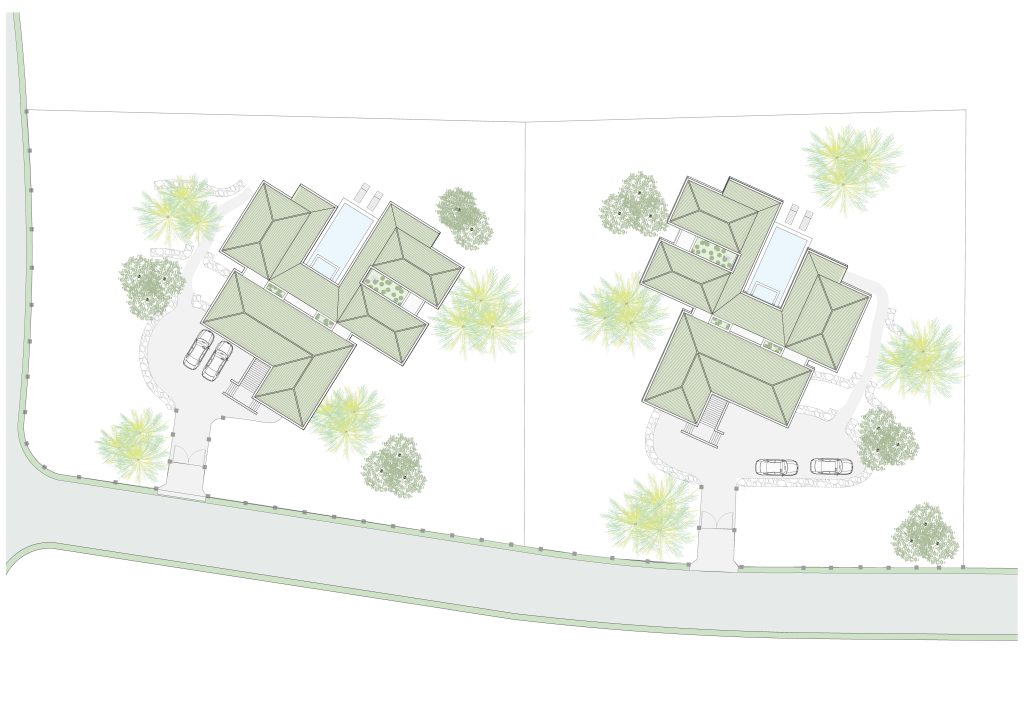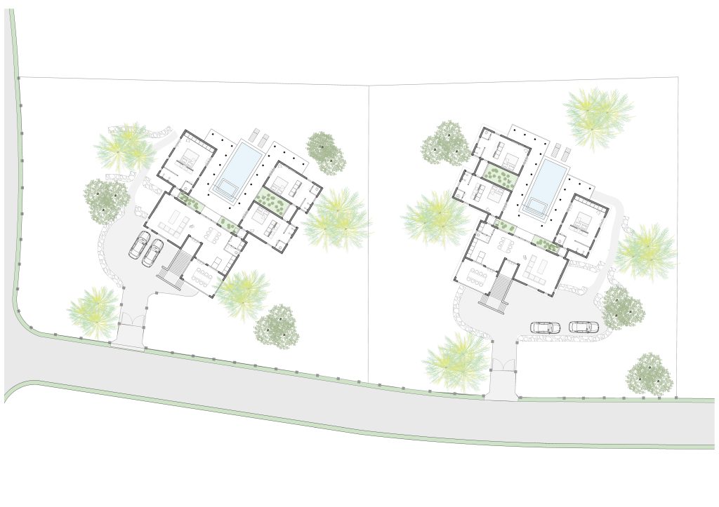 Rice Hill Gardens, two adjacent lots are being developed with a pair of spacious private residences known as the Twin Villas. The villas share the same architectural language and are mirrored in layout.