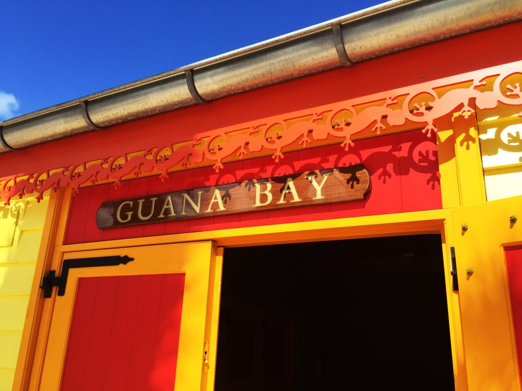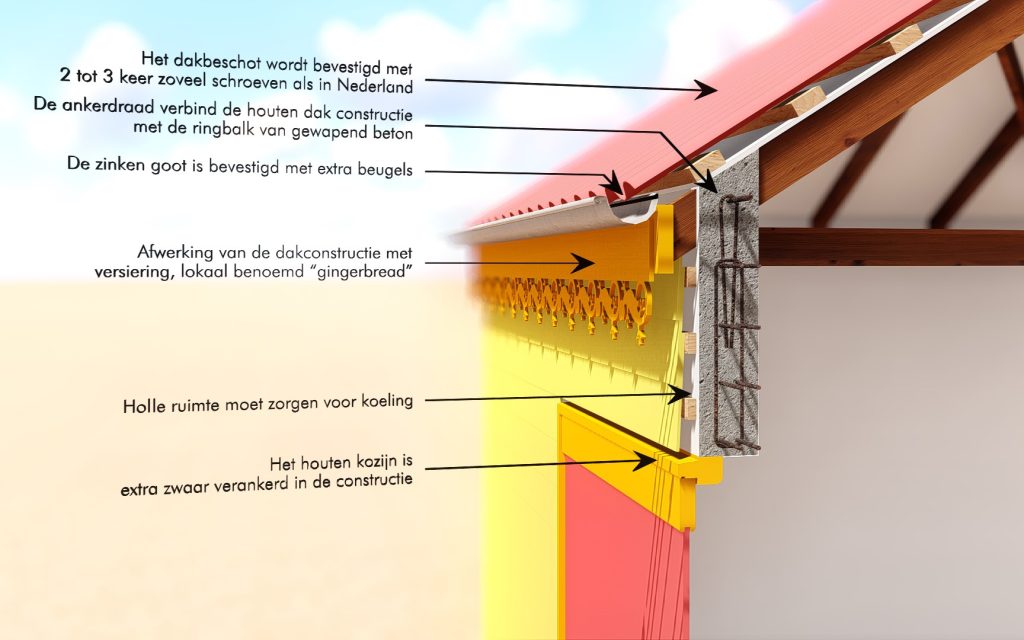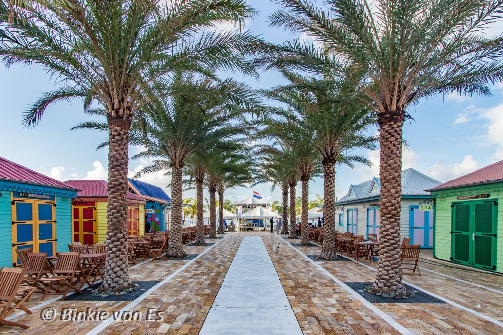 The eight buildings feature traditional Sint Maarten architectural details, including decorative gingerbread along the eaves and wooden exterior wall finishes such as potdekselen and houten rabat. The vibrant color palette follows local painting traditions, reinforcing the site’s cultural identity.