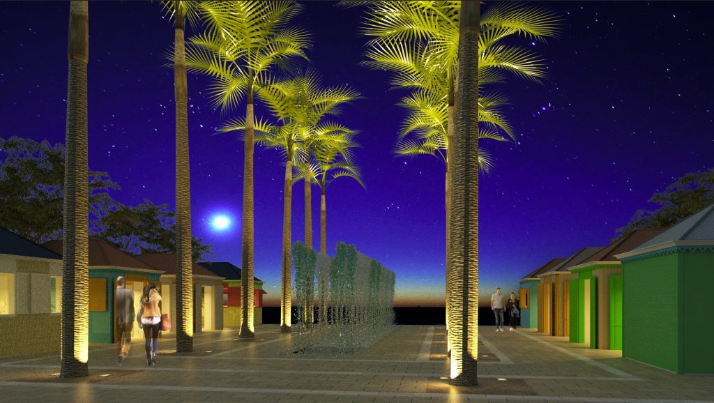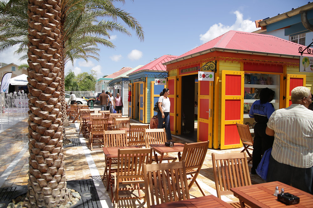 Walter Plantz Square is a vibrant public space defined by a series of colorful, small-scale buildings that reflect the traditional architecture of Sint Maarten, set within a sleek and contemporary urban design.