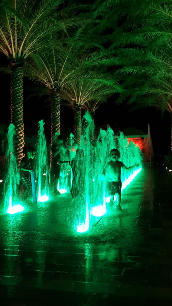 Palm trees aligned along both sides of the central axis provide much-needed shade from the Caribbean sun, while the central fountain adds a cooling effect. A rectangular field of white paving marks the fountain’s footprint, from which water jets emerge through flush-mounted pipes. Integrated lighting transforms the fountain into a fairytale-like feature in the evening. Water drains discreetly through narrow recesses between the carefully crafted travertine and Ibiza white marble paving stones, maintaining a clean and seamless surface.