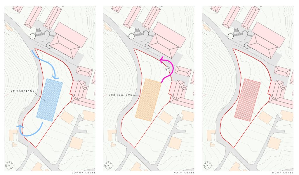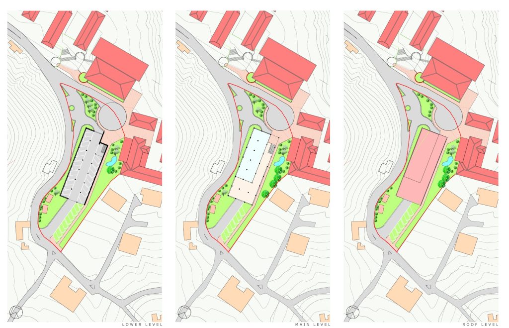 The proposed design was intended to address not only the parking demands of the new Kindergarten and Daycare facility, but also those of the existing Sacred Heart School, the gymnasium, and the comprehensive school. Safety considerations were central to the design. The public area was required to be clearly legible and accessible, with unobstructed sightlines for children and other users. Pedestrian routes connecting parking areas to school entrances were to be clearly defined and minimally intersected by vehicular traffic.