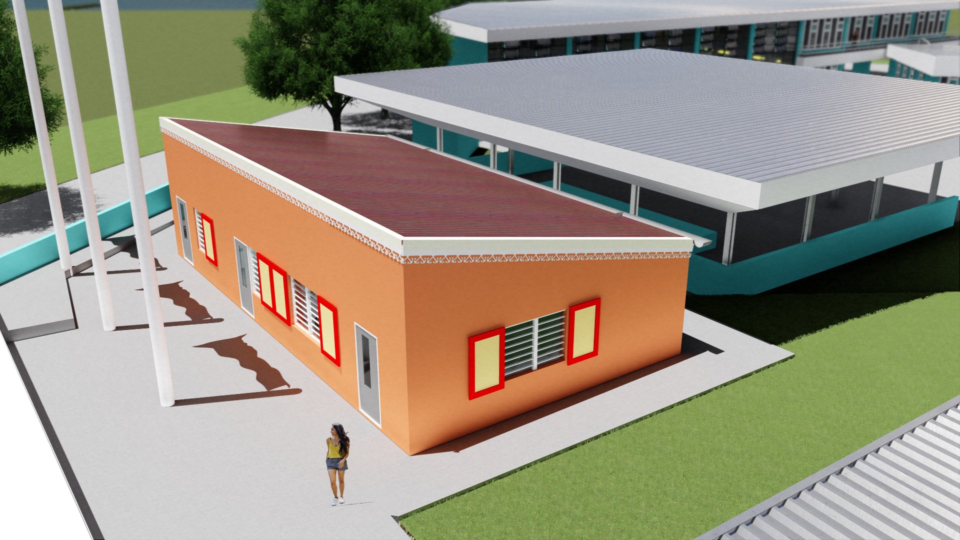 Final design for renovation and extension high school campus on Sint Eustatius. It is a 1980’s unique architectural structure that is divined by diagonals and these sightlines formed the base for the design of the extension. Roof structures with large cantilevers, provide a strong indoor-outdoor connection. The campus has been designed on the winds and geographical location, the new double layered extension of the campus is designed ‘’disaster proof’’ taking notice earth quakes and cat 5+ storms.